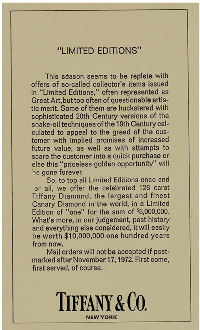Во многих источниках часто упоминают, что Tiffany безуспешно пытались продать бриллиант, но это не совсем правдиво. На самом деле в 70-е годы прошлого столетия пошла мода на лимитированные серии одежды, обуви и конечно же украшений. И вот в 1972 году в газете появилось скорее высмеивающее псевдоограниченные издания объявление о продаже ограниченным тиражом «один» камня за 5000000 долларов в течении 24 часов.