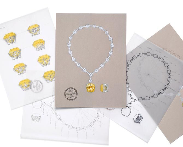 Ожерелье Шлюмберже «Лента Роззет» создано из тончайших нитей с белыми бриллиантами, подразумевающими постоянное, искрящееся движение, а Алмаз Тиффани подвешивался в композиции в качестве центральной розетки.