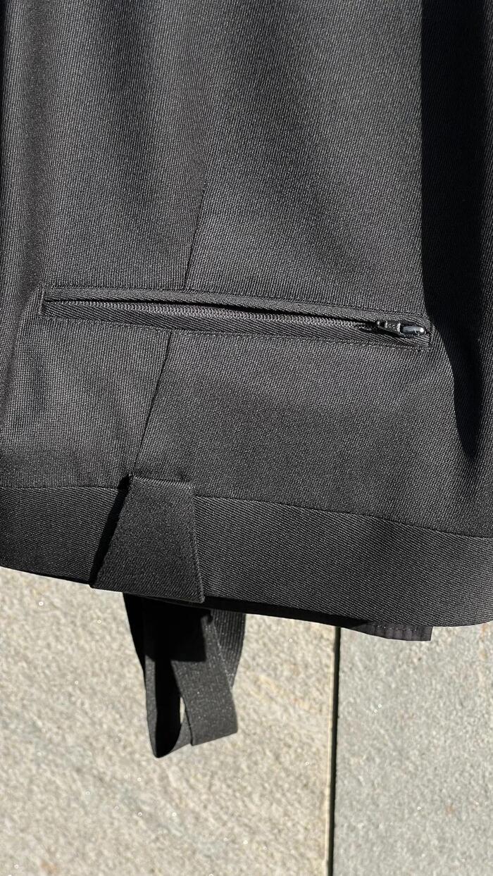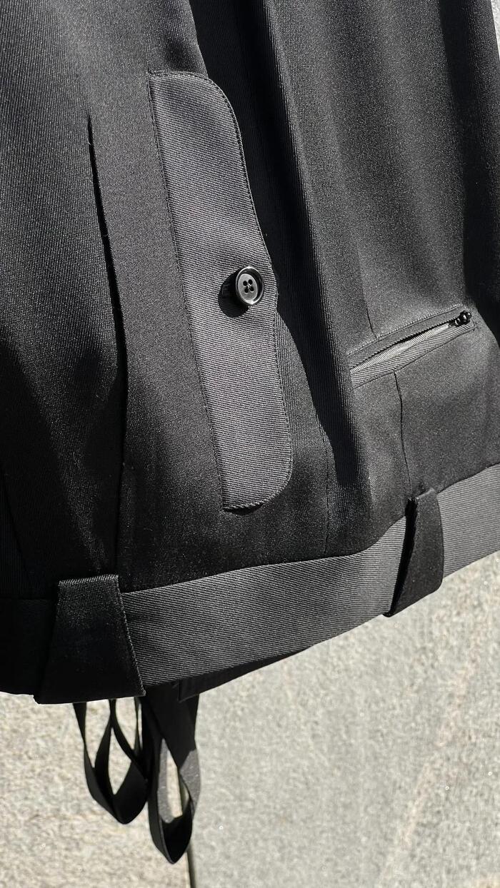Боковые карманы с клапанами, задний карман с молнией, фигурные шлëвки, резинки по низу, гульфик на пуговицах, ручные петли.