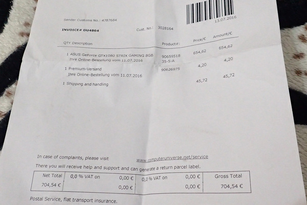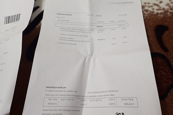 В конце концов, новые внутренности я заказывал двумя частями: основные комплектующие – первой посылкой, видеокарту – второй посылкой. Сделано это было по нескольким причинам. Во-первых, чтобы общая сумма товаров в одной посылке не превышала 1000 евро и не возросла стоимость доставки. Во-вторых, нужной мне видеокарты некоторое время не было на складе в магазине. Так как итоговая сумма заказа составила 1371 евро, я морально подготовился заплатить таможенную пошлину.
