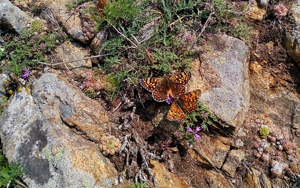 Дорога на вершину мыса Хадарта очень каменистая, так что мы снова не стали рисковать и, оставив машину, поднялись на мыс ножками. Это и для здоровья полезнее - тренировка; и для природы безопаснее. Мыс, как и большинство подобных, покрыт характерной скудной растительностью. Здесь встречаются редкие эндемики, некоторые виды занесены в Красную книгу. Поэтому лучше ходить, и то с оглядкой - не наступить бы ненароком на редкий жёлтый мак или краснокнижную карликовую лилию.
