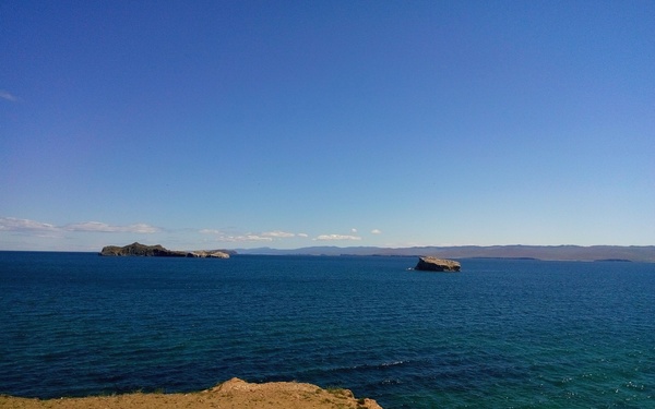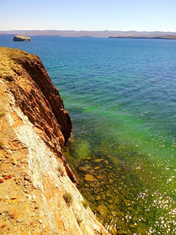 Кроме Хужир-Нугайского залива, что прямо под нами, можно увидеть вдалеке залив Мухор и пролив Ольхонские ворота. Видны и острова: прямо перед нами Большой Тойнак, справа Малый Тойнак. Вдали виднеется Ольхон, прямо напротив нас полуостров Кобылья Голова. А справа в дали виден полуостров Улан-Хада, это уже на материковой части.