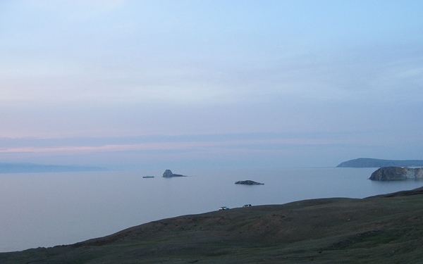 После грозовой ночи в Курминской бухте, когда нашу палатку чуть не унесло в Байкал, наступило утро 14 июля. Погода улучшалась: ветер уносил тучи, солнышко выглянуло, Байкал успокоился, видимость отличная. Помнится, я писал, что белые острова-скалы очень красивы на рассвете? Вот, наконец нашлось то фото, именно этого утра.