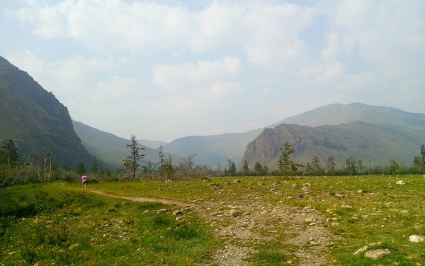 Река Сарма оказалась за деревьями - здесь, в долине, растительность оказалась иной, чем вокруг. Мы уже привыкли к изобилию хвойных пород: сосны обычные и кедровые, ели, лиственницы. А здесь преобладали более привычные деревья - березы, ольха, даже плакучая ива. Густой подлесок. Разнотравье.