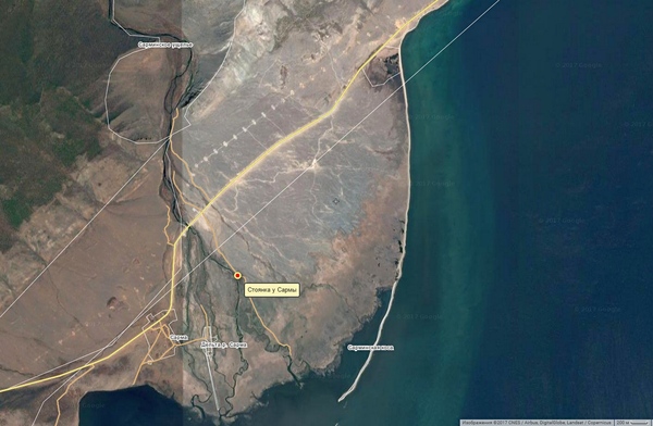 Ещё раз - мыс Уюга (другое название Юган-Хушин). Он отделен от берега длинной косой (мы сюда ещё приедем, исследовать мыс и искать гранаты!)