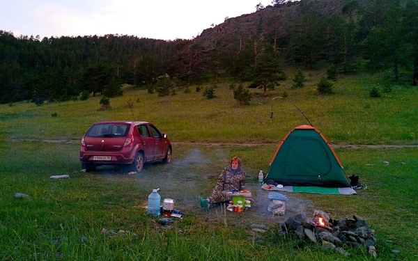 Газовая горелка с баллонами - чудесное изобретение. Весит почти ничего, экономит кучу времени (поиск дров тут проблема!), не пачкает посуду, в отличие от костра. Кстати, не забывайте, что в Прибайкалье летом высокая пожароопасность! Лесные пожары каждый год бушуют. Так что вообще осторожнее с кострами! Смолистые ветки лиственницы и сосны, их шишки, горят хорошо, но здорово стреляют искрами. Обязательно держите неподалёку от костра ведро с водой.