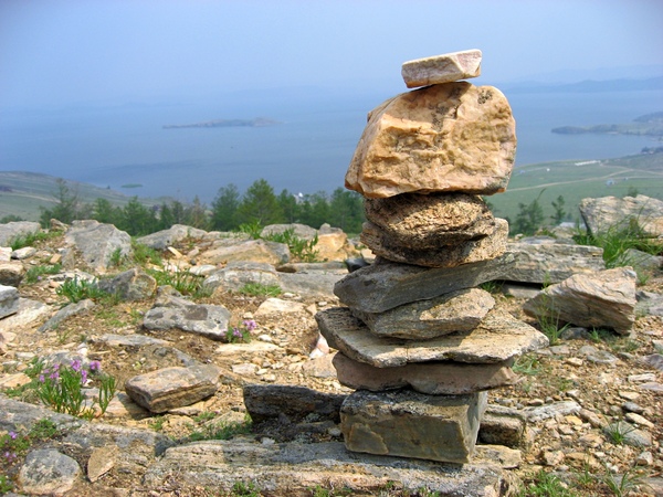 Вернемся на смотровую площадку. Здесь настоящий "сад камней". Туристы отмечаются здесь сооружением каменных пирамидок-обо. Есть и настоящий чёрный обелиск - памятник геологу по фамилии Корж, трагически погибшему неподалёку в водах Байкала - так явствует из надписи.