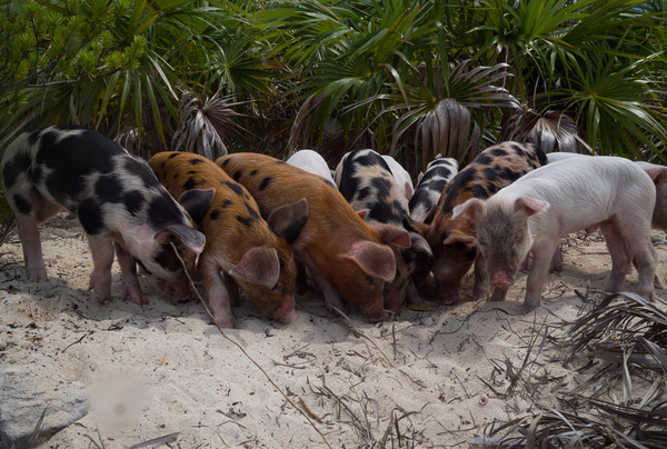 Компания на острове собралась колоритная: белые, рыжие, розовые, коричневые, пятнистые кабанчики, свиньи и поросята. Свинки всех мастей и размеров резво бегают по песчаным пляжам острова и все, от мала до велика, превосходно плавают.