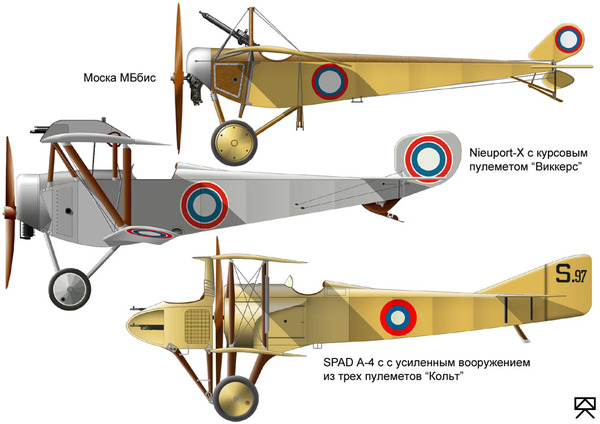 На вооружении первых истребительных отрядов состояли как одноместные, так и двухместные самолеты "Ньюпор-Х", "Кодрон" и другие. Летчик-наблюдатель на таких самолетах выполнял роль воздушного стрелка.