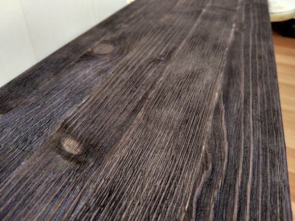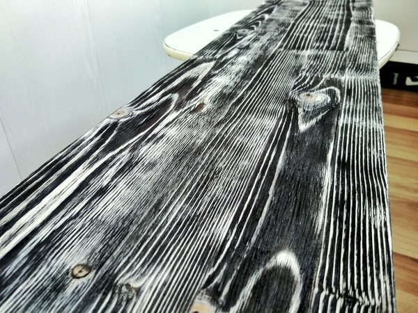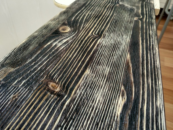 Можно обойтись и без морилки и щеток. Покупаешь газовую горелку (100р баллон и рублей 250-300 сама горелка) и прожигаешь всю поверхность доски. Степень "прожарки" повлияет на конечную глубину фактуры дерева. После берешь кусок грубой ткани и как следует прошлифовываешь ей доску. После, для контраста можно аналогично пройти шкуркой, как ты здесь делал.