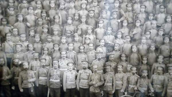 Похоже на "Солдаты и офицеры 177-го пехотного Изборского полка на лагерном поле перед отправкой на фронт. Пенза, 1914 год"