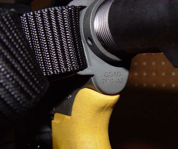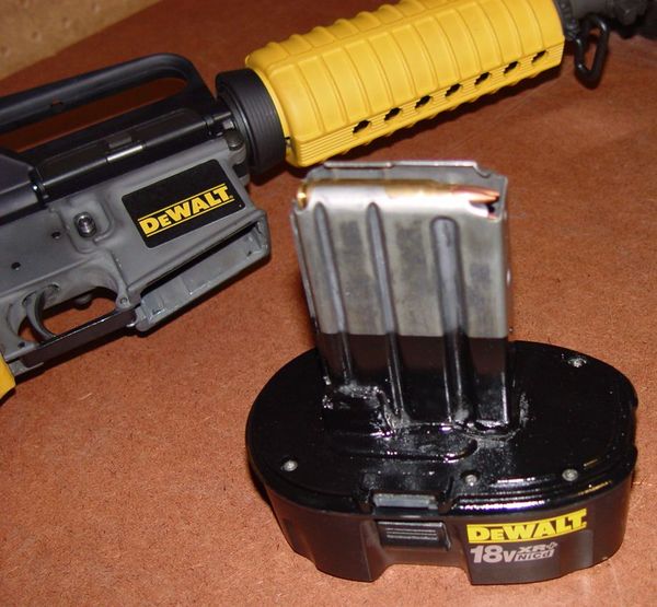 Я недавно достал новую (новую для меня) M16 и как раз приводил её в порядок. Некоторые части всё равно надо было менять, так что я нашёл жёлтый приклад, цевьё и пистолетную рукоять. Потом я съездил на завод DeWALT в нескольких милях от дома за наклейкой; там же я увидел их новые аккумуляторы и купил один. Вернулся домой, нашёл короткий магазин и начал работать. Сначала прикинул размеры отверстия в крышке аккумулятора и аккуратно высверлил его, вставил туда магазин, залил эпоксидной смолой и, пока смола не схватилась, примерил к винтовке чтобы убедиться, что всё подходит. После того, как эпоксидка затвердела, я срезал её излишки и покрасил нижнюю часть магазина чёрной армейской краской (Krylon)».