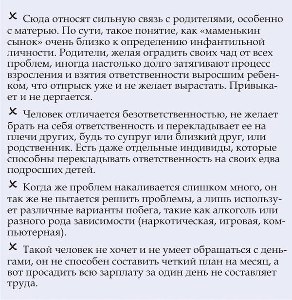 Если говорит об инфантильности конкретного человека, то есть ряд характеристик, которые позволяют увидеть проблемы. Подобного рода «тормоз» основательно портит жизнь, не позволяя личности раскрыться в полной мере.