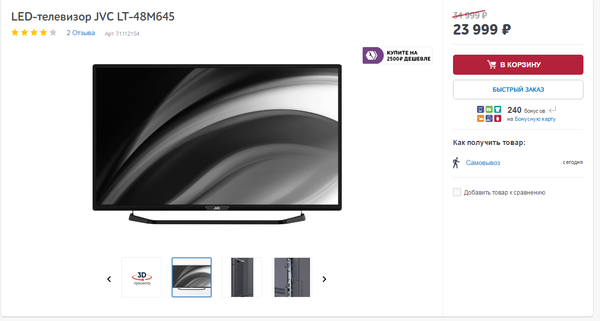 Заказываем телевизор. В обед отпрашиваемся и мчимся в магазин. Прихожу на кассу и тут мне говорят, что виртуальной картой оплатить товар невозможно, надо было делать при заказе. Захожу на сайт, личный кабинет и заказ подготовленный к выдаче уже нельзя оплатить картой. Что делать. Можно поменять карту на физическую, но это займет примерно 30 минут. Долго. Мне говорят, что можете отменить заказ и сделать его повторно, но уже оплатив. Хорошо. Отменяем заказ. Но тут сделать повторно не можем... Оказывается, чтобы сделать заказ, у них на складе должно быть минимум две штуки товара на складе. А склада у них два в магазине...и картина получается такая, что 1 товар на одном складе, второй на втором складе. Если они сейчас сделают возврат товара на склад, то он появится только завтра на остатках. Печаль беда.
