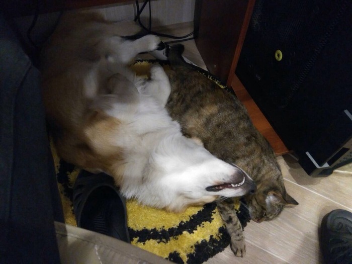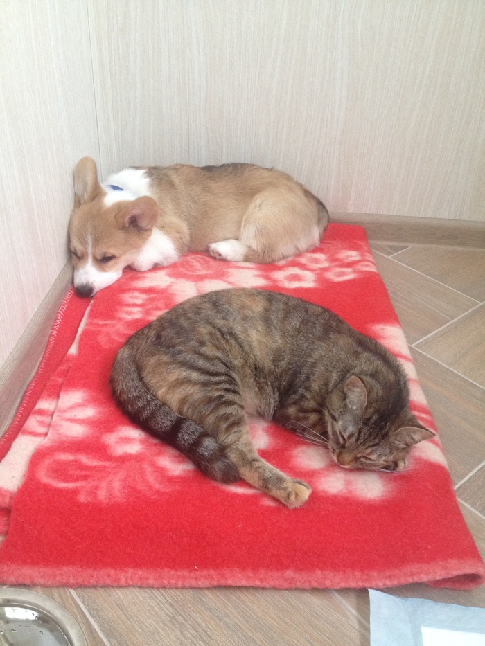 Теперь это лучшие друзья. Помню, как однажды, уходя из дома, щенка оставили в вольере, а кошку на свободном перемещении по дому. Пришли с работы, открываем дверь, а встречают нас две радостные моськи - и кошка, и собака. Квартира была не разрушена. После этого щенка в вольере не закрывали, оставляли по присмотром Баси. Она его практически усыновила, вместе играю, спят. Если собака начинает совсем уж доставать кошку - она уходит на своё место, куда пёс не может достать. Так и живут)