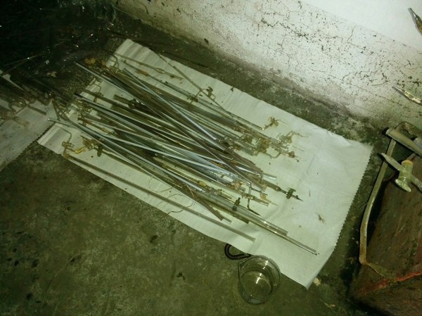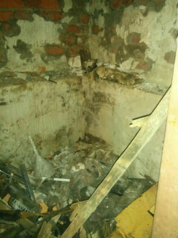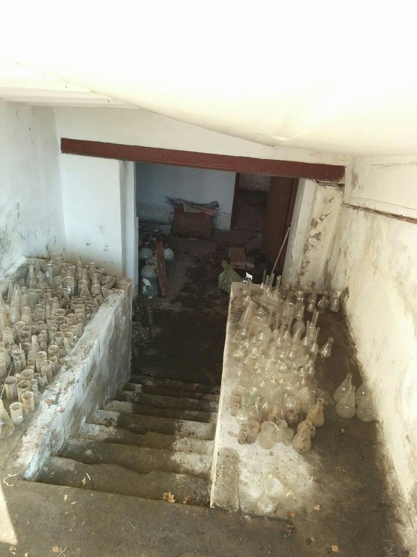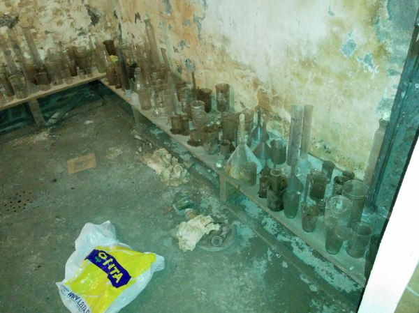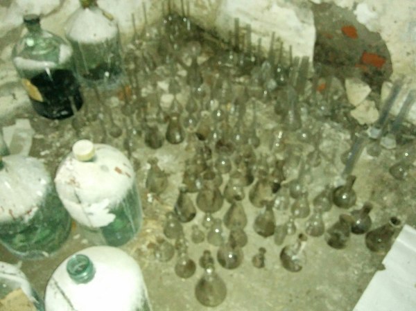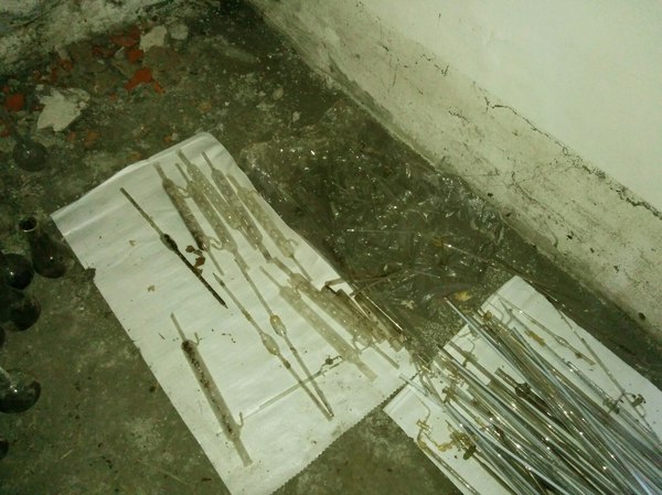 Начали осматривать помещение и в одном из закутков нашли обломившийся стеллаж с битым стеклом