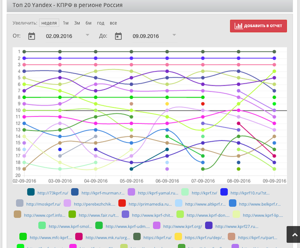 Pravdaserm позволяет посмотреть все показатели в удобном графике и добавить их в отчет, который сразу можно распечатать. Не удивлюсь, если пиарщики партий уже и сами пользуются этим сервисом для мониторинга репутации.