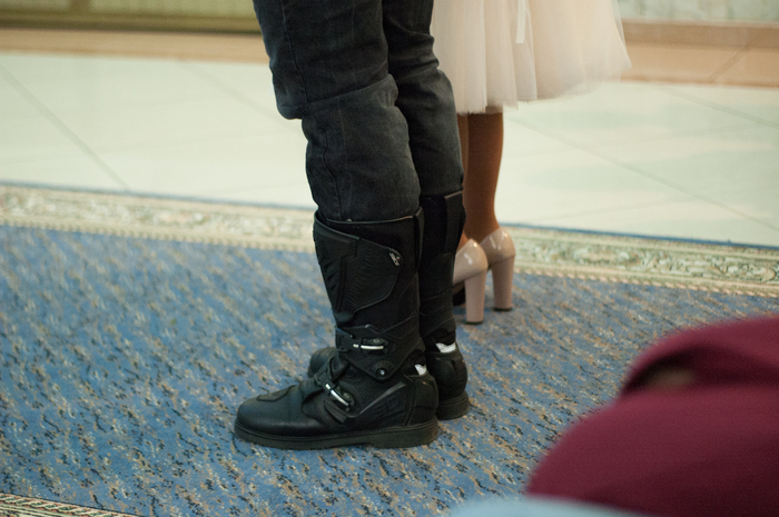 День свадьбы - всегда волнительно. Все красивые, нарядные и местами в экипировке. Да, верхняя часть на официальной части мероприятия снимается, но ботинки остались у всех.