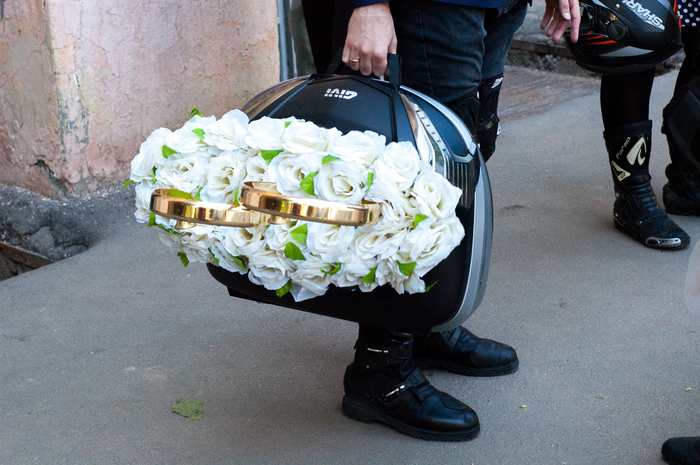 С чего начинается свадьба? Конечно же, с предложения. А где предложение, там и кольца. А раз свадьба у мотоциклистов, то и кольца - особенные. Оба фамильные, подготовлены членом семьи. Специально обученная фирма сделала гравировку на заказ, за что я им очень благодарен.