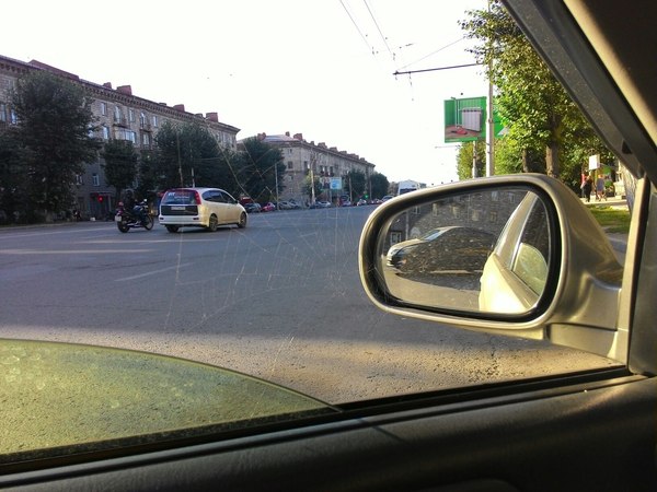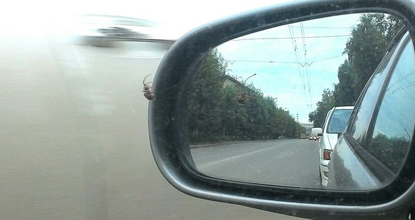 А у меня в левом зеркале заднего вида обосновался паучок. Сплёл себе паутинку от зеркала до рамки двери и бегает по ней периодически.