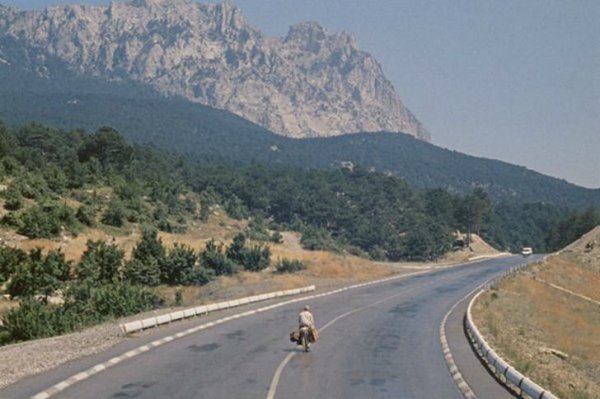 Погоню снимали на старом шоссе Алушта – Судак, когда там еще на поворотах стояли обзорные зеркала для водителей. А вот уснувший за рулем машины Бывалый (а вернее, его дублер, Моргунова после одного скандала Гайдай отстранил от съемок) едет по сосняку в районе Никиты. А заканчивается все на Ай-Петри. Там машина застывает на краю пропасти, и Шурик успевает достать из нее связанную Нину. Весь транспорт в кадре тоже с крымскими номерами – «скорая», увозившая пьяного Шурика (84-95 КРП), и рефрижератор, где замерзала троица (36-87 КР). Отметился в кадре и Симферополь. Съемки улицы у «психбольницы» проходили там вдоль забора консервного завода им. 1 Мая.