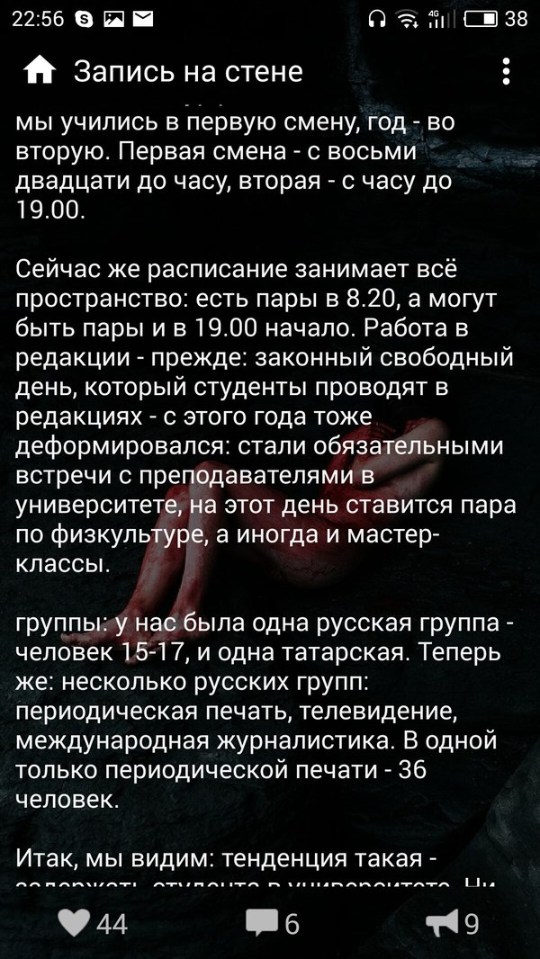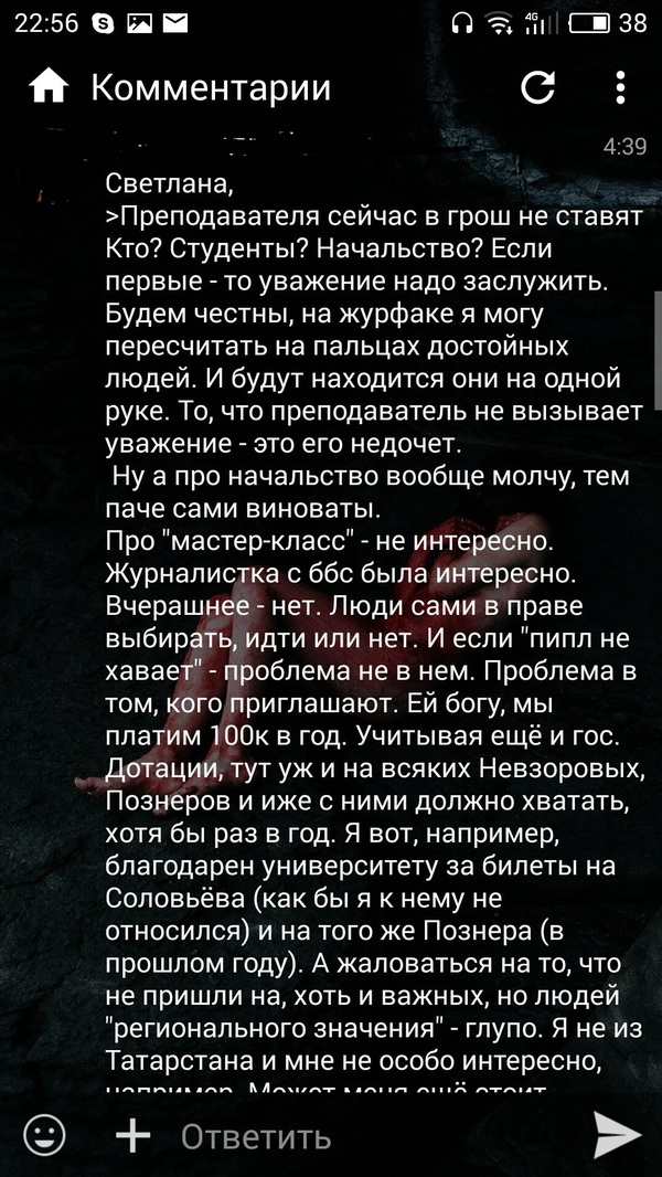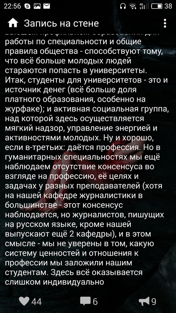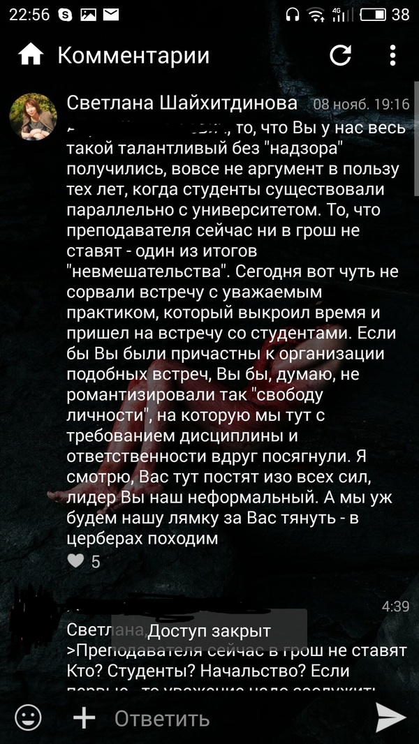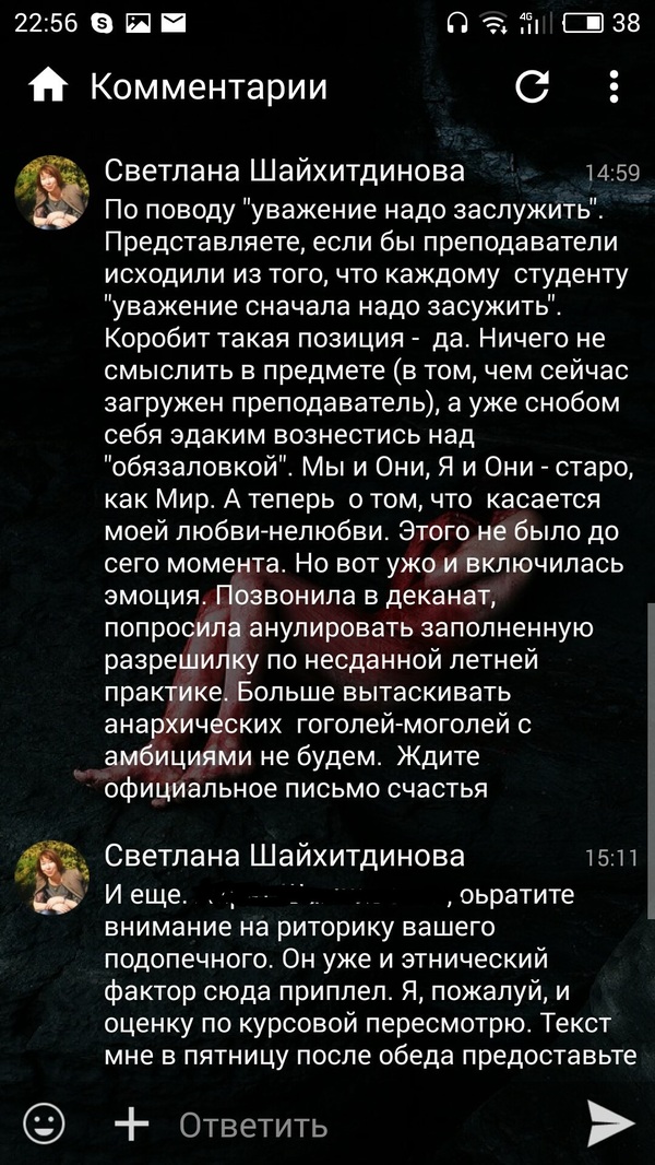 Приветсвую. Есть один университет. И в нем меня отчислили за один долг, без комиссий, без пересдач, из-за того, что я в коментах под одной записью перечил зав. кафедре. В итоге за один долг за один день был подписан приказ об отчислении. Типа, мне уже пришло предложение это всё осветить в одной газете. Сама ситуация крайне потешная. Я, конечно, понимаю, де, сам виноват, не надо было хвостов набирать, но сам факт того, что один человек из-за комента может тебя отчислить за день - крайне потешен. Ну и да, сам пост на стене одного из преподавателей, которого лично я уважаю.