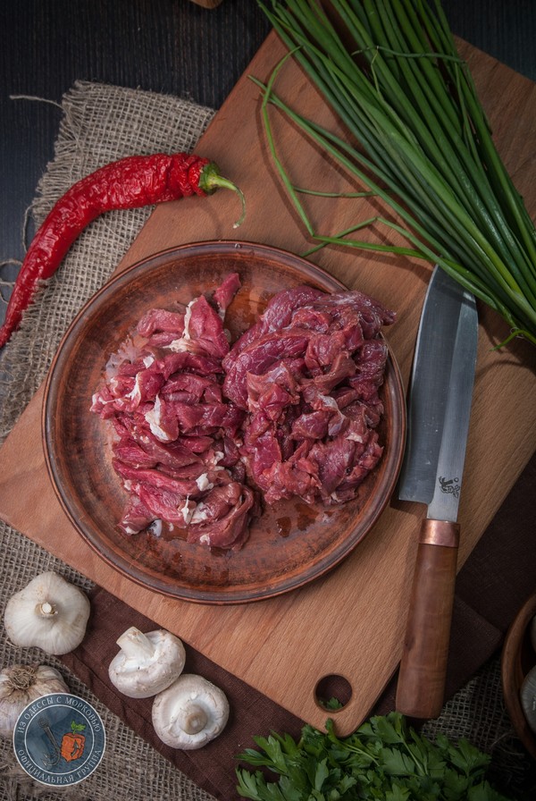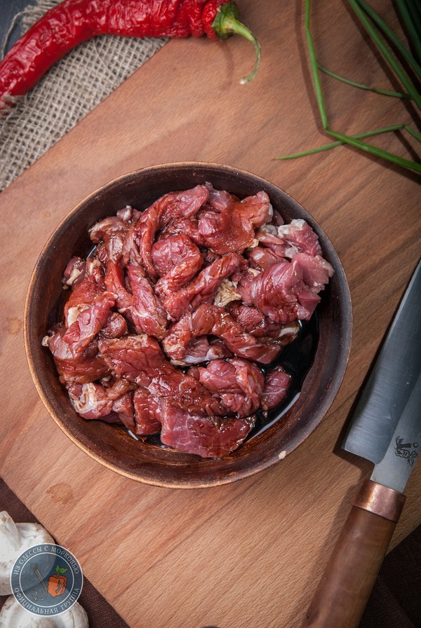 - Говядину и свинину нарезать тонкой соломкой. Легче это делать, если мясо слегка подморожено.