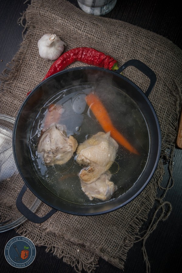 Бульон я сварил простой: из нескольких куриных бедер и морковки. В небольшом количестве воды вышел достаточно наваристый бульон. Для моих целей хватило с головой. Вы можете поступить также или обойтись водой или увеличить количество пива.