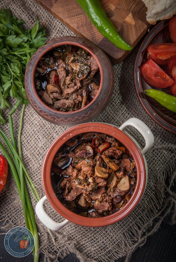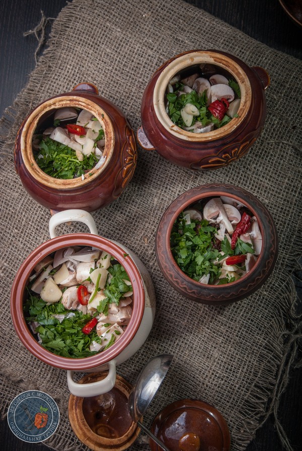 - Мясо переложить в горшки, добавить нарезанные шампиньоны и залить пивом. Добавить порезанный чеснок, петрушку и бульон.По желанию добавить немного красного перца. Приправить. У меня была лишь соль и черный перец. Сильно не солите- соевый и так соленый.