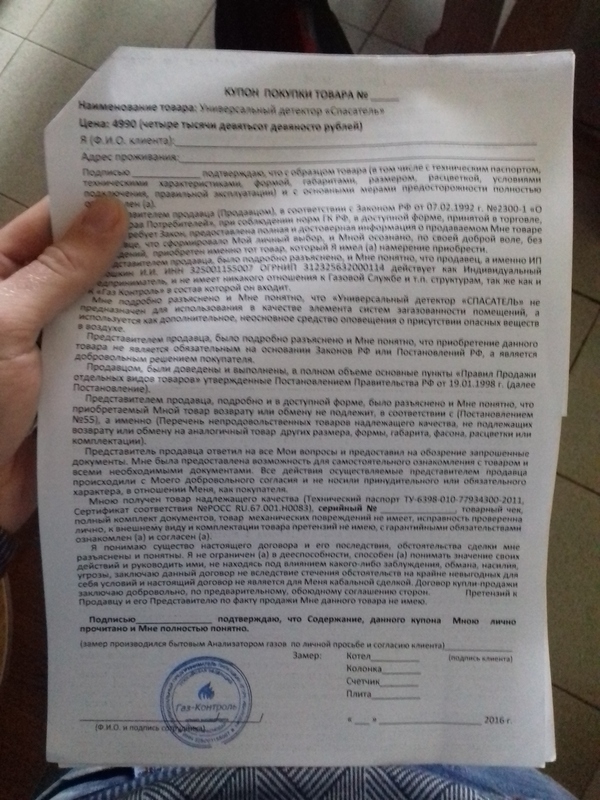 Дальше шёл договор, где раз по 10 было написано, что ФИО "добровольно и без принуждения приобретает прибор стоимостью 4900 руб." (!!!). Причём, вместо "ГАЗ-контроля" какой-то ссаный ИП Пилюшкин))) На логичный вопрос , схуяли делом муниципального учреждения занимается сраный ИП-шник, парень ответил, что "у нас лицензии, номера есть и бла-бла-бла". Вёл себя, кстати, на редкость уверенно и нагло, общался в приказном тоне. Уточнить информацию предложил по сотовому телфону))) За откровенный развод в хамоватой манере был изгнан за периметр квартиры, за предложение подписать им отказ был также послан на йух.