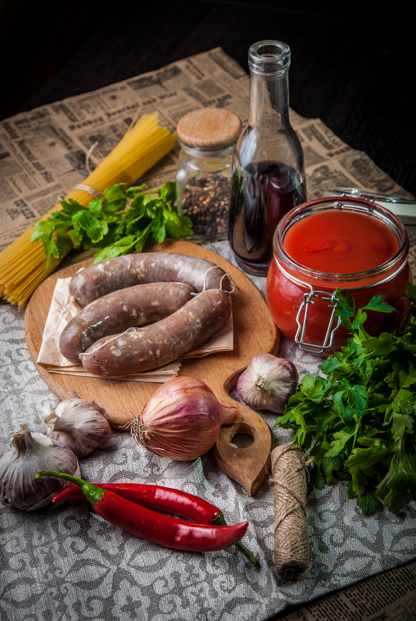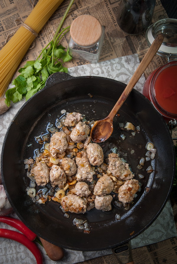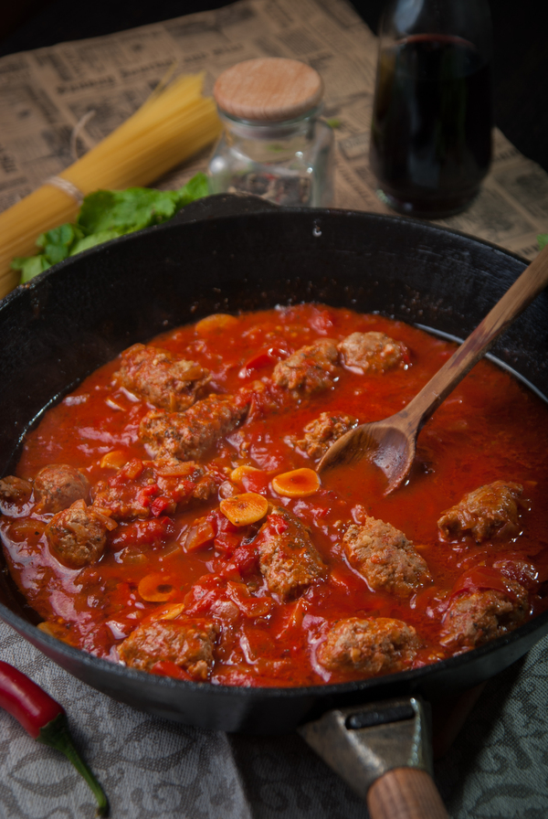 - 500г. свиных колбасок, фарша или тефтелей. В оригинале использовались итальянские сальсичча.