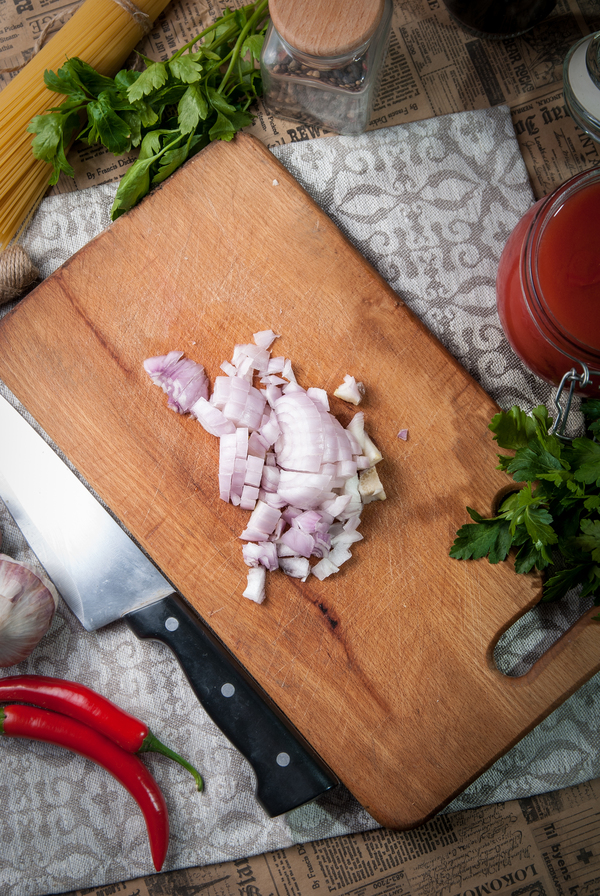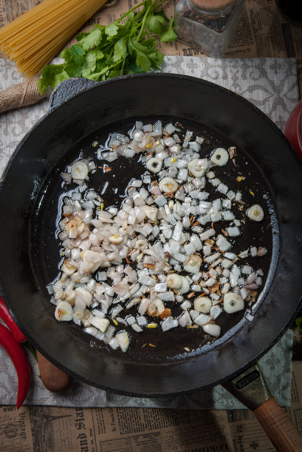 - Поджарить в оливковом масле нарезанный кубиком лук и порезанный крупно - чеснок.