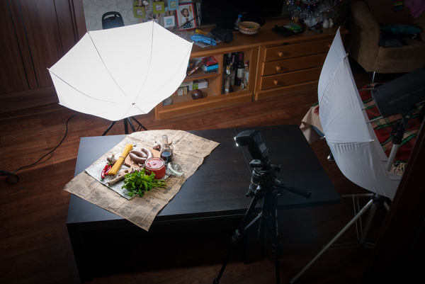 Основной источник (слева), вспышка с контровым светом и мобильная никоновская вспышка ( я ее двигаю и подсвечиваю нужное по ситуации) + белые отражатели в виде кусков ватмана (по надобности).