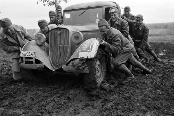 Венгерские солдаты выталкивают застрявший немецкий штабной автомобиль «Фиат 508»