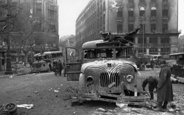 Советские солдаты снимают колеса со сгоревшего автобуса на улице Будапешта.
