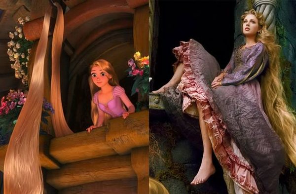 Одной из последних под брендом Walt Disney Pictures примерила корону 18-летняя Рапунцель. Живой моделью для этой героини послужила принцесса поп-сцены Тейлор Свифт. Ох, уж эти волосы! Известно, что длина ее волшебной золотистой прически составила 21 метр, в ней больше 100 000 отдельных локонов. Раньше никому в истории мультипликации не доводилось рисовать такое количество волос. Чтобы достоверно воспроизвести эту роскошь, съемочная группа анимировала 147 женщин с волосами разной структуры, из которых в итоге и получился нужный объем прядей. Работа над прической Рапунцель была настолько кропотливой, что один из компьютерных инженеров, после запуска фильма, защитила диссертацию по анимации волос.