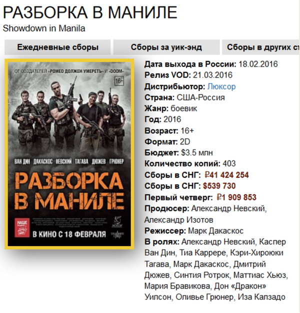 Вот примеры. Берем ту же несчастную "Разборку в Маниле" (уж простите меня за это). Что там на сайте "Кинопоиска"? $583 тысячи. Во что верится слегка с трудом.