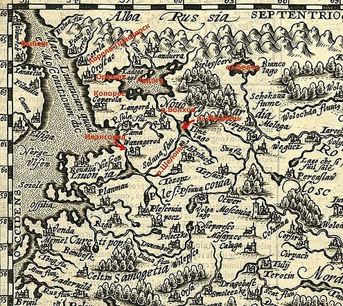 На шведской карте, датированной 1643 г., имеются любопытные рисунки и надписи. В частности, на ней нанесена местность, где расположен Петербург — такой, какой она была до Петра I. По берегам Невы (Нуен) изображены каменные строения, подписанные «Камни – фундаменты – руины каменных домов». В месте впадения Охты в Неву на карту нанесен город. Петр Первый называл его Ниеншанц, то есть крепость на Неве. Возле города подпись: «Horer: staden: til» — «Окрестности города Тиль». Тиль — это имя немецкого или фламандского происхождения. Напротив устья р. Охта на карте изображен Стасский собор. Удивительно то, что сейчас на этом же месте находится главная духовная святыня города. Речь идет про Александро-Невскую Лавру, построенную в 1710 году. Она же не могла попасть на карту за 60 лет до основания Петром Великим Петербурга? Если верить этой карте, то до строительства Петербурга здесь, среди болот, были развалины древнего города. Который и восстановил Петр 1. Какой культуре принадлежал этот город — можно лишь догадываться. Или вы все еще считаете, что Петербург построили на болотах крестьяне в лаптях?