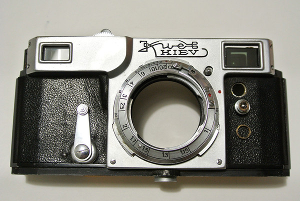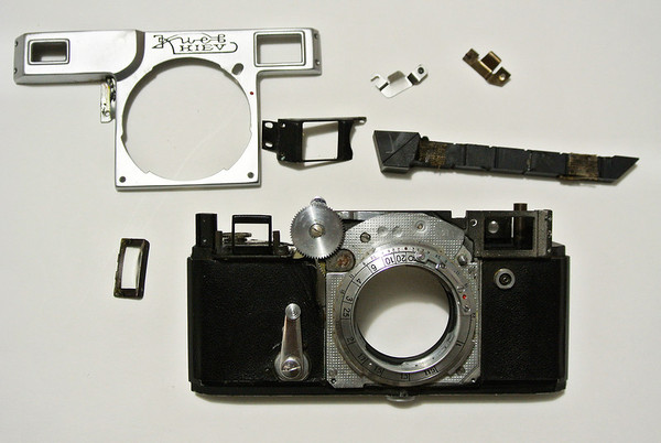 Дальше сборка. Вот этих двух "важных детелей" к этом Киеве не было. Я говорю о двух черных бумажках, прикрывающих щели между корпусом и затвором. Их лепили на все, без исключения, Киевы 4/4а/4м/4ам.
