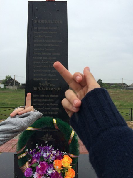 Две школьницы провели провокационную фотосессию на месте мемориала, установленного в память жертвам Великой Отечественной войны. Девушки целовались и показывали "фак" в сторону фамилий погибших. Снимки они опубликовали в одном и пабликов про вписки, назвав всё происходящее... впиской.