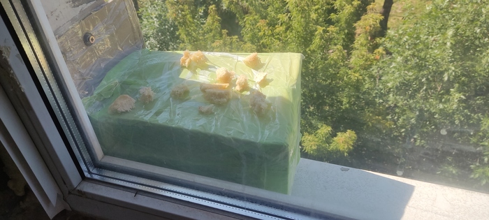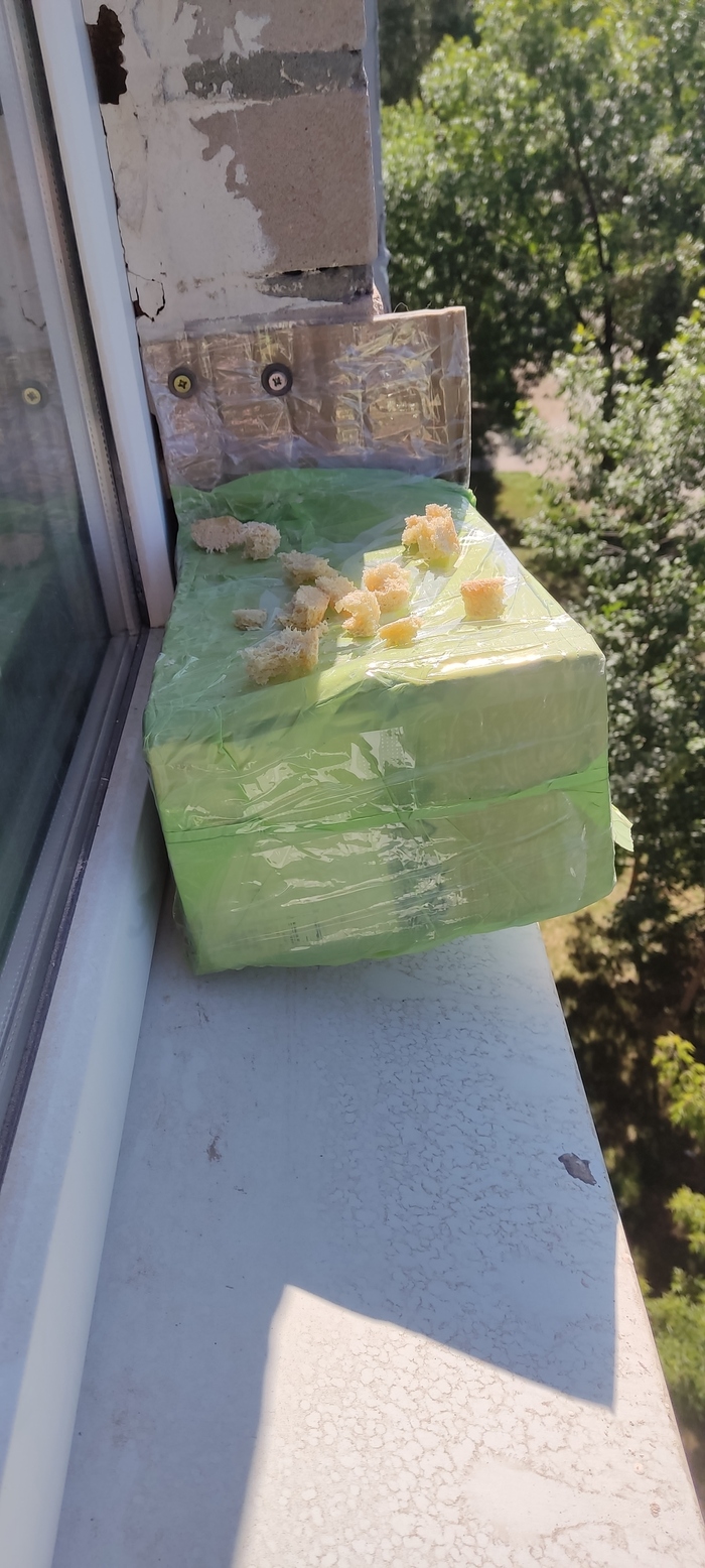 Было принято решение смастырить на скорую руку домик птицу и перенести туда яйца. Взял коробку, перемотал скотчем, замотал пакетом (чтоб дождем не размочило) и прикрепил за подоконник. Вот так (хлеб уже дочь с сыном накидали, в надежде, что птиц вернется и будет продолжать заботиться о детях)