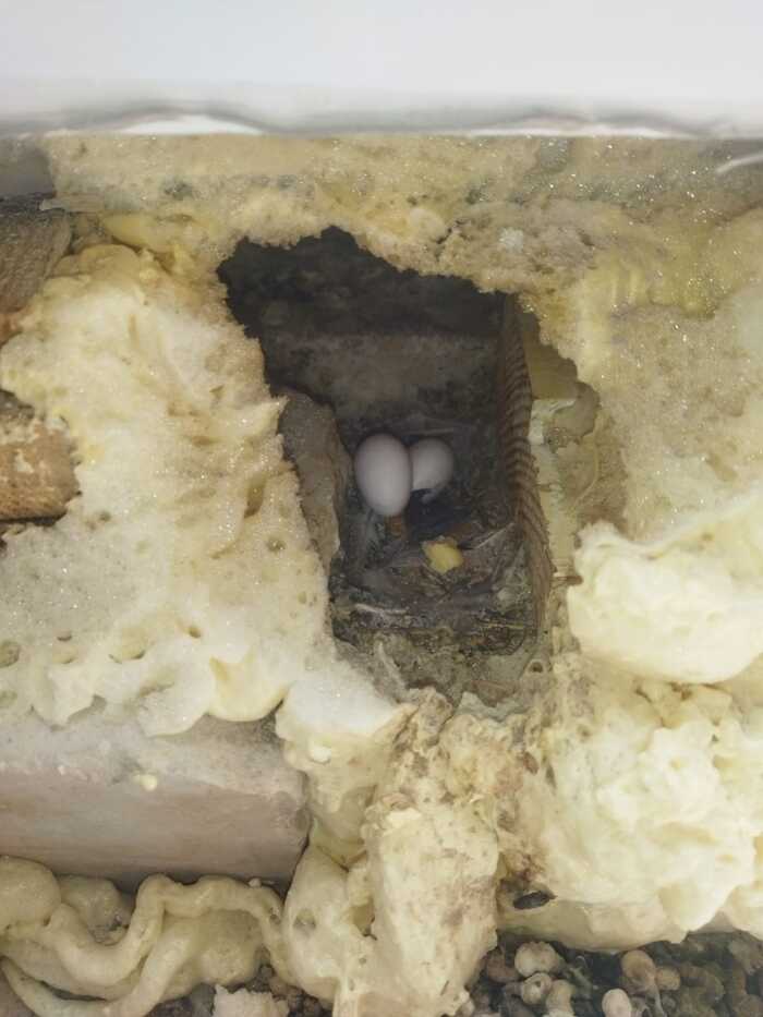 Яйца были осторожно пинцетом перенесены в коробку (чтобы не оставлять на них человеческий запах), и уложены на кусок пены, типа, в гнездо. С внешней стороны коробки есть отверстие, типа дверки.