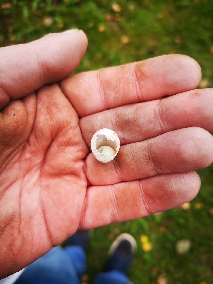 Сегодня на дачном участке убирал в компост, горки листьев и скошенной травы, у одной кучи наткнулся на это яйцо граблями. Шестое октября, от яйца не пахнет тухлятиной, пробил граблями. Вопрос чье может быть?