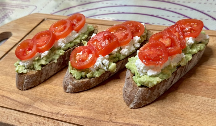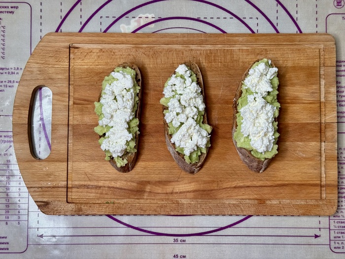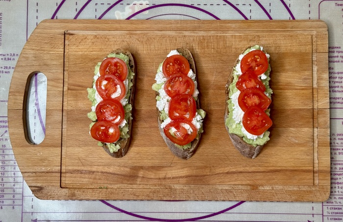 На хлеб выкладываю сначала авокадо, потом брынзу. Сверху украшаю помидорами.