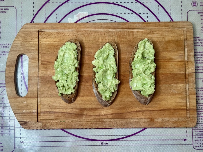 Нарезаю чиабатту на кусочки примерно 1- 1,5 см толщиной. Для одного авокадо мне обычно хватает 3 кусочка. Разогреваю сухую сковороду. Подсушиваю кусочки чиабатты на сковороде. 1-2 минуты с каждой стороны на сильном огне до образования хрустящей корочки сверху. Внутри хлеб должен остаться мягким. Кстати, с бородинским хлебом получается тоже очень вкусно.