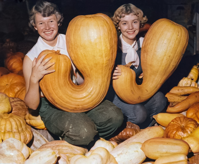Хизер Хейвуд из Нарромайна и Энн Твиди из Уолган-Вэлли на Королевской пасхальной выставке с гигантскими тыквами «Багл Грамма». Они помогали расставлять их в овощном отделе. Австралия, апрель 1958 года.