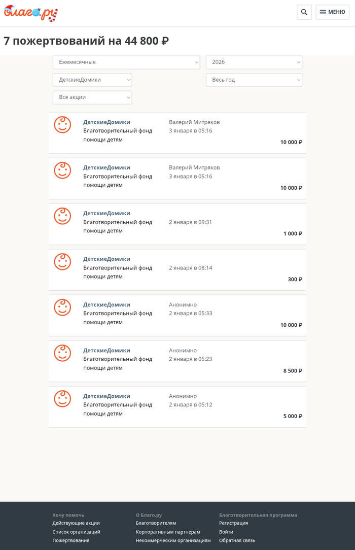 "ДД" – из 14 регулярных пожертвований на общую сумму 92 800 осталось 7 на сумму 44 800;