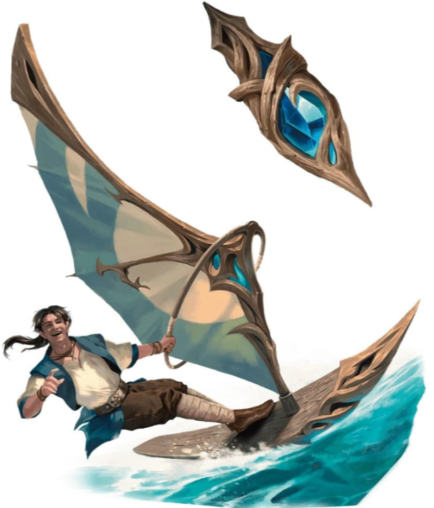 Ветряной челнок выглядит как скромное украшение. Но если вы используете действие и тратите один заряд (из трех), Ветряной челнок расширяется, превращаясь в парусное транспортное средство, размером и формой примерно с дверь дома, с торчащим из его бока парусом высотой 10 футов. Челнок парит в нескольких дюймах над любой поверхностью, на которой находится, и имеет скорость передвижения 40 футов. Если вы отрываетесь от твёрдой земли, он скользит, перемещаясь на 5 футов по горизонтали на каждый 1фт. вашей высоты.