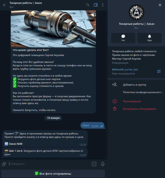 Сбор данных. Клиент нажимает /start, и бот ведет его по шагам: просит фото/чертеж, уточняет материал, габариты и срочность. Это сильно упрощает прием заявки! Токарю нужны данные, которые для заказчика могут казаться не очевидными. И обычно заказ превращается в длинную переписку с уточняющими вопросами, чтобы и мастер и клиент пришли к общему знаменателю.