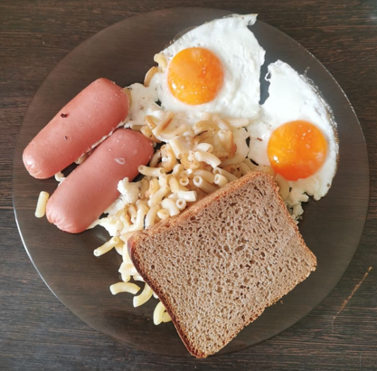 Разогрел вчерашние макароны, поджарил сардельки и добавил туда два яйца, чтобы добрать хоть как-то белки. Как покажет итог дня, меня это не особо спасло, а вот стоимость обеда увеличило аж на 16 рублей. Ну ещё и капусты съел 60 грамм, нужно присмотреть в магазине кочан и прикупить сразу килограмма 2 для закваски.